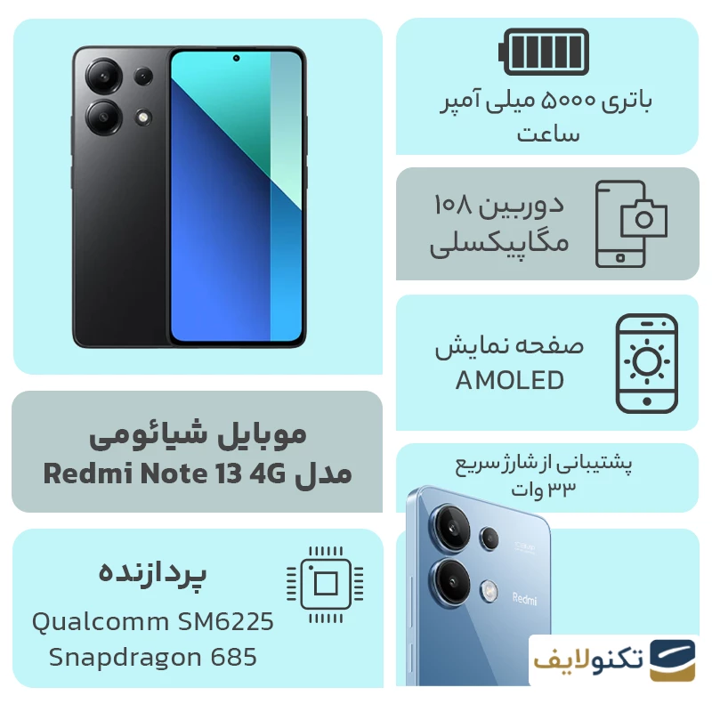 گوشی ردمی نوت 13 یک اسمارت فون اقتصادی محسوب میشود که مشخصات فنی آن مانند پردازنده، باتری و موارد این چنینی نیز بر همان اساس چیده شدهاند. بنابراین نباید انتظاری فراتر از رده این گوشی ردمی داشته باشیم. این اسمارت فون بر پایه اندروید ۱۳ و MIUI 14 به بازار روانه شده. ۲۵۶ گیگابایت حافظه برای آن در نظر گرفته شده که میتوانید آن را ارتقا دهید. رم گوشی نیز ۸ گیگابایت است. پردازندهای که به این اسمارت فون اختصاص داده شده اسنپدراگون ۶۸۵ است. این پردازنده شاید بتواند برخی بازیها را اجرا کند، اما از آنجا که پردازنده مخصوص گوشی گیمینگ نیست، بهتر است برای گیم روی آن حسابی باز نکنید و اگر گیمر هستید، سراغ گوشی دیگری از خانواده ردمی نوت ۱۳ بروید و به خرید گوشی گیمینگ مانند ردمی نوت 13 پرو پلاس فکر کنید. ردمی نوت ۱۳ 4g از نظر دوربین نیز عملکرد قابل قبولی دارد اما مناسب عکاسی حرفهای نیست. دوربین اصلی گوشی یک لنز واید با سنسور ۱۰۸ مگاپیکسلی است و با یک دوربین ۸ مگاپیکسلی با لنز اولترا واید و یک دوربین ۲ مگاپیکسلی با لنز ماکرو همراه شده است. برای ثبت تصاویر سلفی نیز، این گوشی یک لنز واید با سنسور ۱۶ مگاپیکسلی در نظر گرفته است. هم دوربین اصلی و هم دوربین سلفی قابلیت فیلمبرداری ۱۰۸۰p با نرخ ۳۰ فریم بر ثانیه ثبت کنند. باتری که برای نوت 13پرو استفاده شده نیز یک باتری با ظرفیت ۵۰۰۰ مگاپیکسل است که از شارژ سریع ۳۳ وات پشتیبانی میکند اما خبری از شارژ معکوس نیست؛ و برای این که کامل شارژ شود نیز کمی بیش از یک ساعت زمان نیاز دارد.